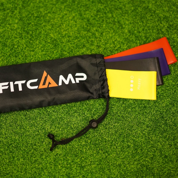 Minibands 4 – pack med ulike styrkenivåer; light, medium, heavy og x-heavy. Perfekt å ta med seg på reise eller bruke i forbindelse med hjemmetrening. Strikkene leveres i en tøff og praktisk FitCamp – pose